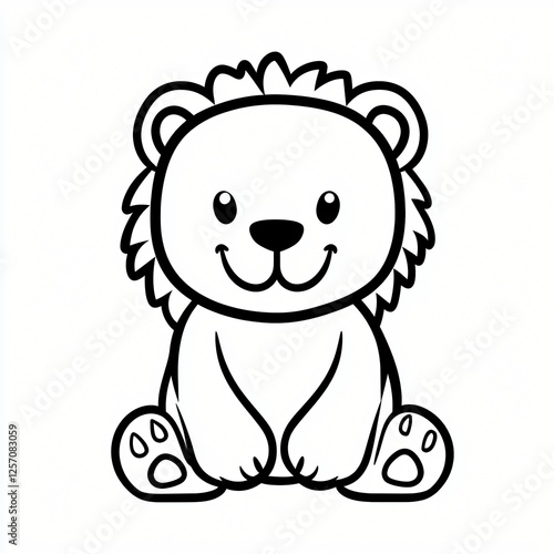 © WisChi, Obraz premium Adorable Cartoon Lion Cub Illustration Cute Sitting Baby Lion Black and White Line Art