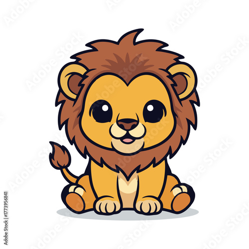 © ardian, Fototapeta premium Adorable cartoon lion cub with big eyes and a fluffy mane sitting down.