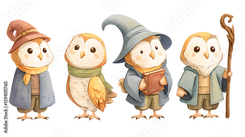 Fototapeta premium Adorable Cartoon Owls in Wizard Attire Watercolor Illustration