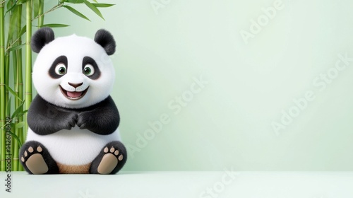 Fototapeta premium Adorable Cartoon Panda, Bamboo, Green Background