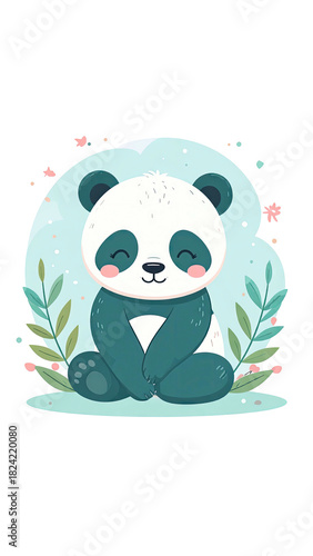 Obraz premium Adorable cartoon panda bear sitting peacefully with closed eyes and rosy cheeks.