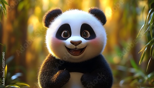 Fototapeta premium Adorable Cartoon Panda in Forest Setting with Warm Light