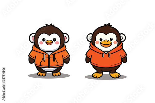 Obraz premium Adorable Cartoon Penguins in Cozy Orange Hoodies: Cute and Playful Animal Characters for Merchandise, Kids' Apparel, and Branding