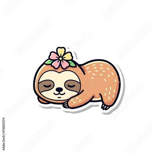 © Riad, Naklejka premium Adorable cartoon sloth with flower on head, isolated on white background
