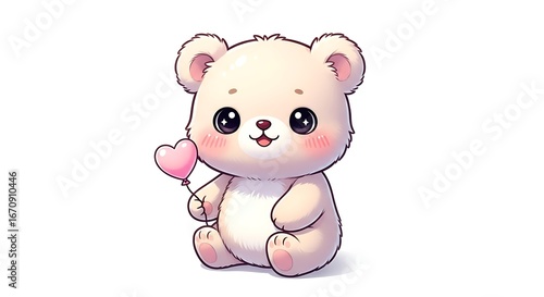 © Bruno, Naklejka premium Adorable cartoon teddy bear holding pink heart balloon isolated on white background conveying love and affection
