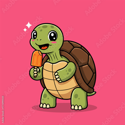 © bima, Fototapeta premium Adorable cartoon tortoise mascot happily eating a frozen orange popsicle against a bright pink background.
