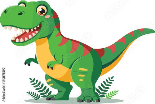 Fototapeta premium Adorable cartoon Tyrannosaurus Rex illustration, a friendly green dinosaur perfect for children's designs, education, and prehistoric themes.