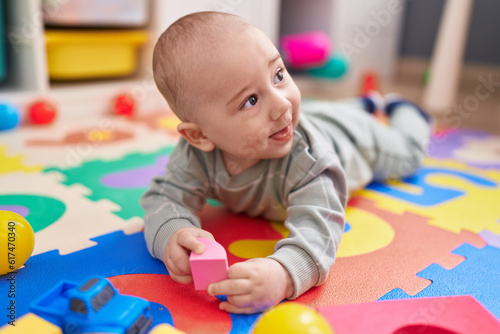 Obraz premium Adorable caucasian baby smiling confident lying on floor at kindergarten