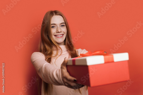 © Strelciuc, Fototapeta premium Adorable caucasian woman with freckles and red hair is giving at camera a present box smiling on a red studio wall