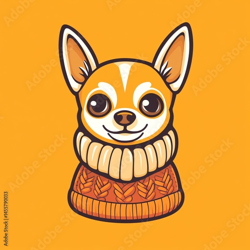 © Parn, Obraz premium Adorable Chihuahua in a cozy knit sweater, happy expression, against a warm orange background. Perfect for pet apparel!