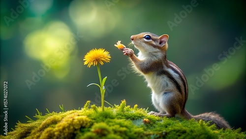 © Newly, Obraz premium Adorable Chipmunk Holding a Dandelion Petal in a Lush Green Forest Setting
