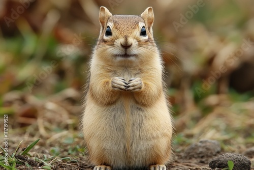 © Alienmarsh, Fototapeta premium Adorable chipmunk standing on hind legs, looking directly at the camera in a natural outdoor setting.