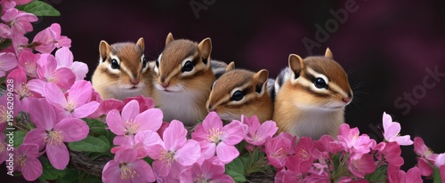Obraz premium Adorable chipmunks nestle among vibrant spring blossoms in this charming scene.