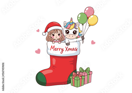 © VECZOMLAND, Obraz premium Adorable Christmas Stocking with Girl Unicorn and Balloons Merry Xmas.
