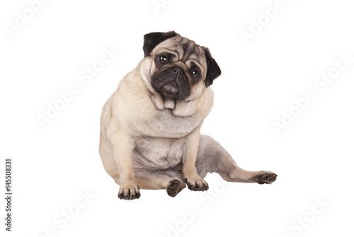 Obraz premium adorable cute pug puppy dog sitting down, isolated on white background