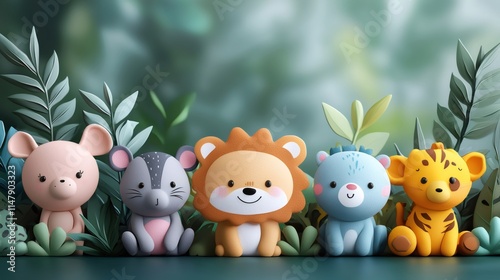 © Lubos Chlubny, Naklejka premium Adorable 3d cartoon animals sitting in lush green foliage