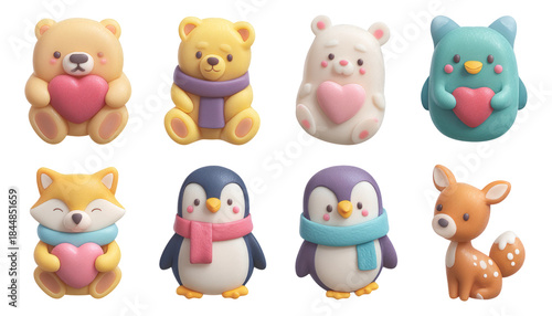 Naklejka premium Adorable 3D Clay-Carved Plush Animals with Heart Decorations on Transparent...
