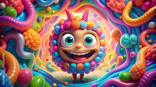 © Man888, Fototapeta premium Adorable 3D illustration of a smiling intestine with big eyes and a cheerful expression, surrounded by colorful abstract shapes and whimsical details.