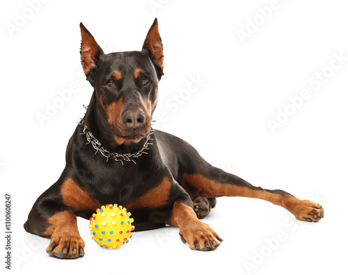 © New Africa, Obraz premium Adorable Doberman with toy on white background. Domestic pet