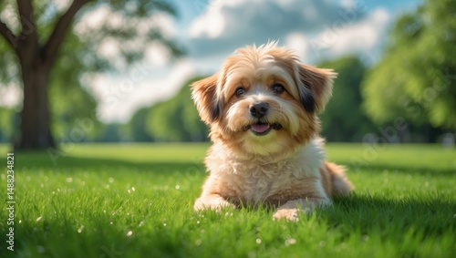 © Holo Frame, Fototapeta premium Adorable dog on green grass in the park