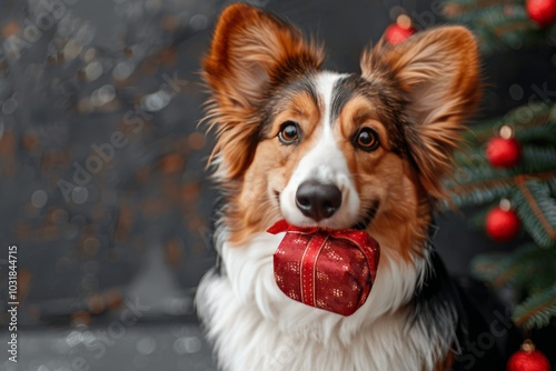 Fototapeta premium Adorable dog with a gift in mouth poses near a Christmas tree decorated with...