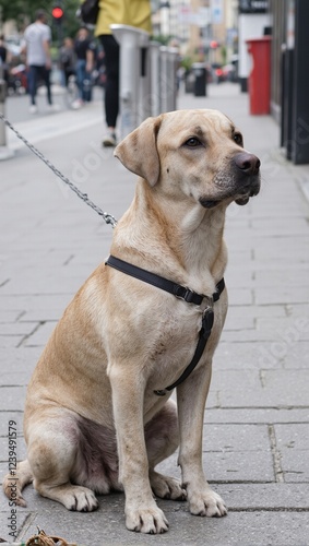 © GMeta, Obraz premium Adorable dog with leash sitting on urban sidewalk