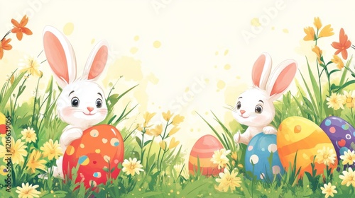 Fototapeta premium Adorable Easter bunnies and colorful decorated eggs nestled among vibrant spring flowers and lush green grass creating a cheerful festive mood