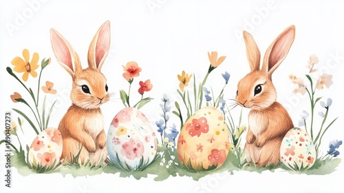 © Sunny, Fototapeta premium Adorable easter bunnies sitting next to a decorated egg, creating a charming easter scene