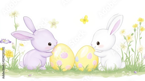 Obraz premium Adorable Easter Bunnies with Painted Eggs – Cute Spring Illustration for...