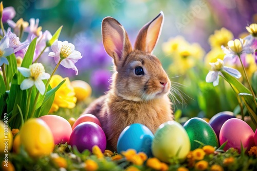 Fototapeta premium Adorable Easter bunny macro shot; vibrant spring eggs and delightful...