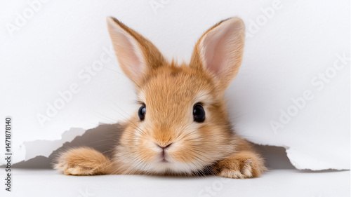 © AnyPic289, Obraz premium Adorable Easter bunny peeking through torn paper wall