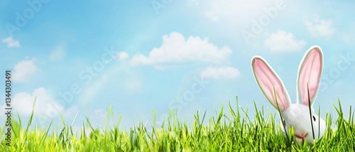 © Blueloner, Fototapeta premium Adorable Easter Bunny Rabbit Hiding in Green Grass, Blue Sky Background