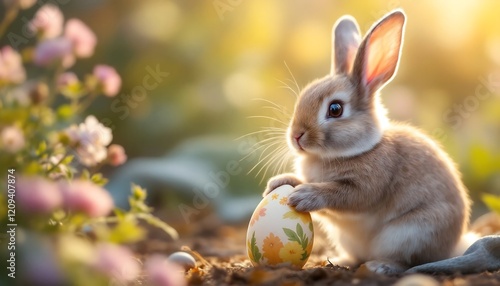 Fototapeta premium Adorable Easter Bunny with Decorated Egg in Spring Garden - Stock Photo