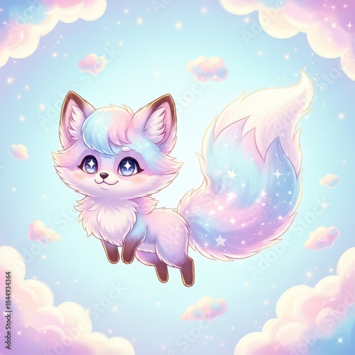 Obraz premium Adorable fantasy fox with pastel fur floats happily among starry clouds in a...
