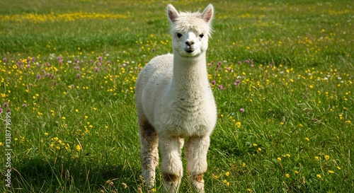 © Duc, Fototapeta premium Adorable fluffy alpaca stands serenely in bright sunlight amongst wildflowers. AI Generated