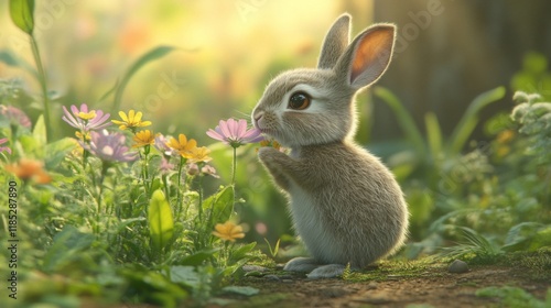 Fototapeta premium Adorable Fluffy Bunny Sniffing Flowers in a Sunny Meadow