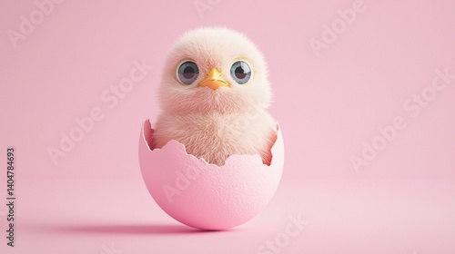 © WisChi, Fototapeta premium Adorable Fluffy Chick Emerging from Pink Easter Egg Shell on Pink Background