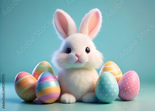 Fototapeta premium Adorable Fluffy Easter Bunny with Pastel Eggs