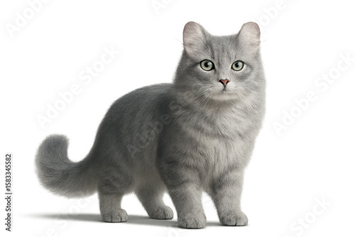 Obraz premium Adorable fluffy grey cat with green eyes isolated on transparent background.