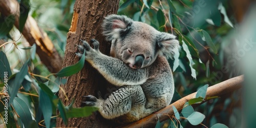 © AkuAku, Fototapeta premium Adorable fluffy koala relaxing on an evergreen tree branch in the zoo