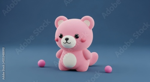 Obraz premium Adorable fluffy pink cartoon bear character with small pink balls on a solid blue background