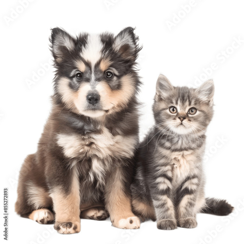 © Elchin Abilov, Obraz premium Adorable fluffy Pomsky dog pup sitting together with British Shorthair cat kitten Looking towards camera Isolated on transparent background PNG