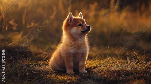 © harryaishi, Fototapeta premium Adorable fluffy puppy sitting in sunset grass.