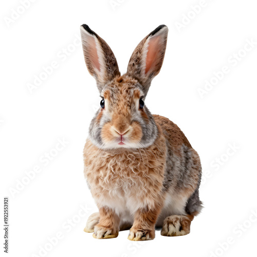 Obraz premium Adorable fluffy rabbit with brown and gray fur sits upright on white background