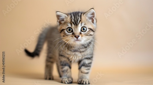 © LookChin AI, Obraz premium Adorable Fluffy Scottish Fold Kitten Posing on Pastel Yellow Background