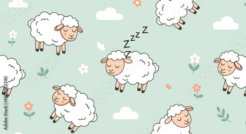 Fototapeta premium Adorable fluffy sheep sleeping peacefully in a dreamy meadow with soft clouds...