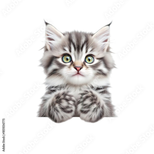 Fototapeta premium Adorable fluffy silver tabby kitten with big green eyes peeking curiously over an edge on transparent background