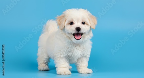 © Pixel Corner, Obraz premium Adorable Fluffy White Puppy Smiling On Bright Blue Background.