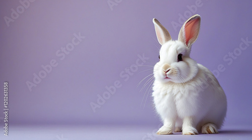 Obraz premium Adorable fluffy white rabbit sitting against a soft purple backdrop. Perfect...