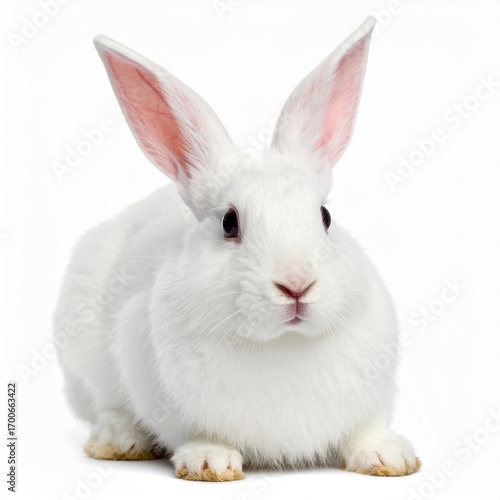© Agus, Obraz premium Adorable fluffy white rabbit with big ears sits patiently on white background
